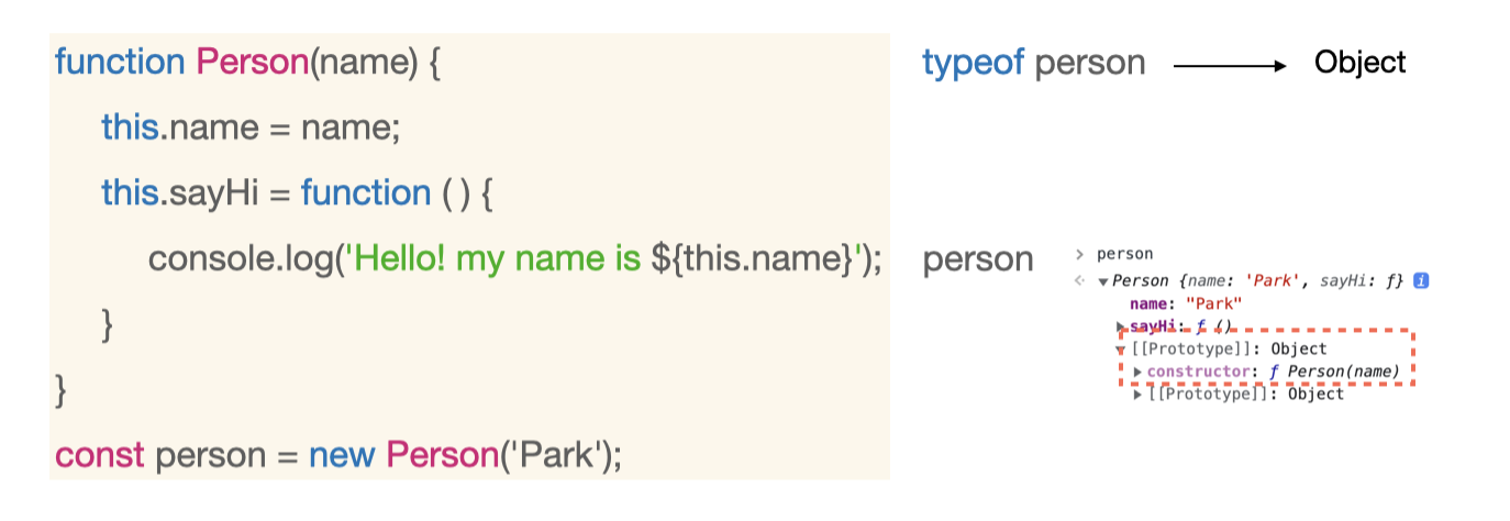 new 연산자를 통해 Person 생성자 함수로 만든 인스턴스를 살펴보면 Object 타입을 가지고 있다