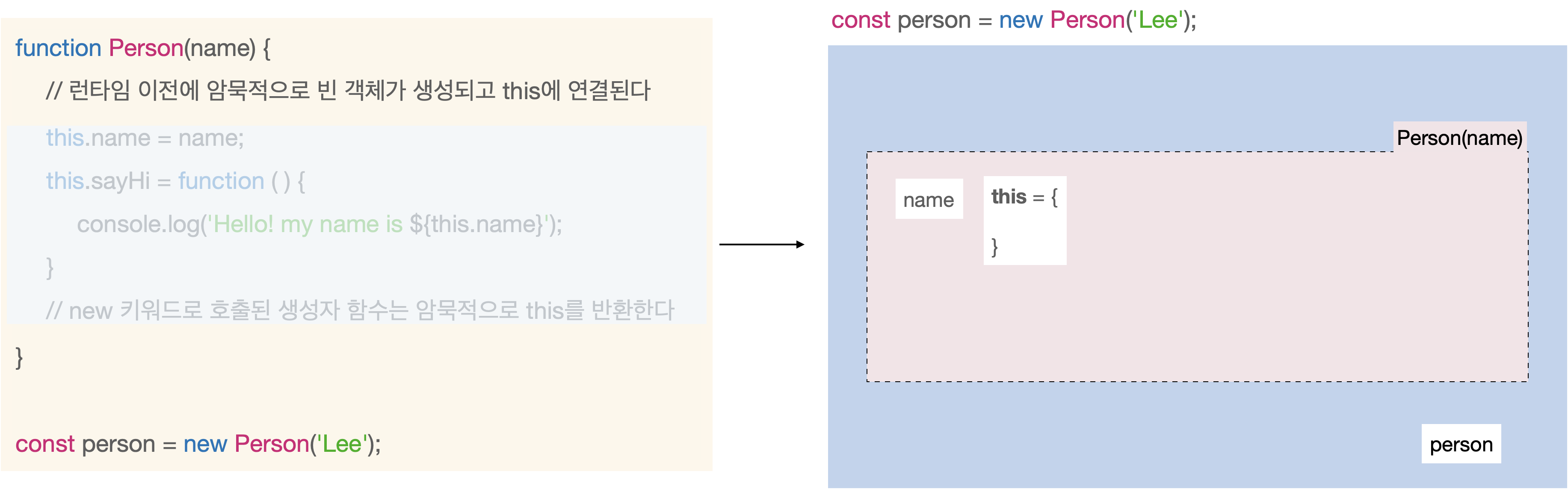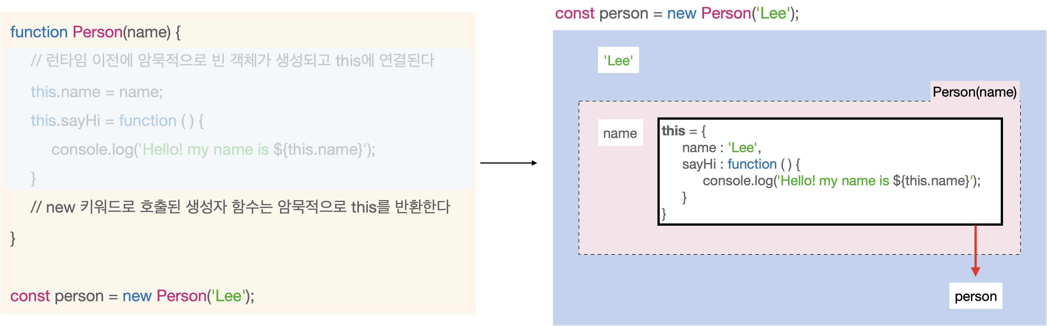 Person 예시로 생성자 함수로 인스턴스가 만들어지는 과정을 그려보았다.