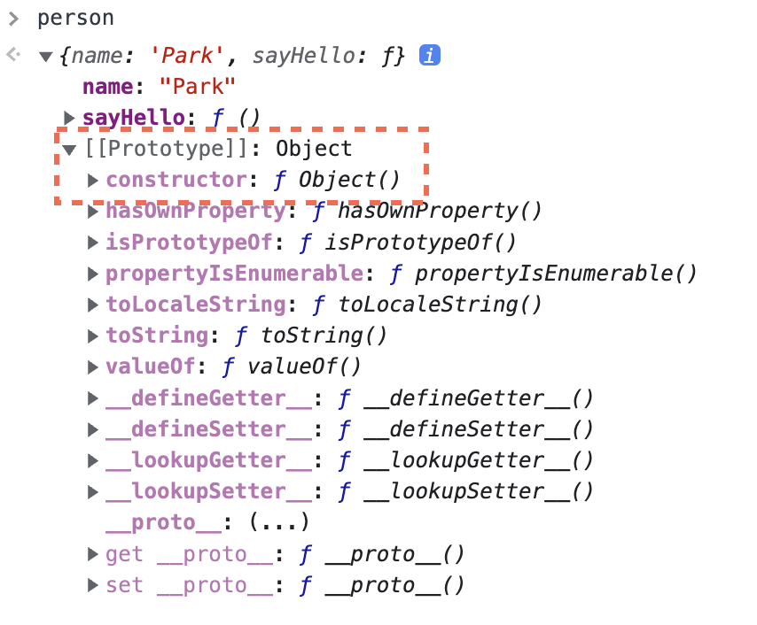 브라우저 콘솔에서 확인해보면 person의 프로토타입을 확인해보면 생성자 함수가 Object 임을 확인해볼 수 있다.