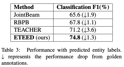 제안된 모델의 성능의 타당함을 보여주고자 저자들은 test time에 golden annotation뿐 아니라 예측된 entity type label을 이용하여 성능을 비교했습니다.