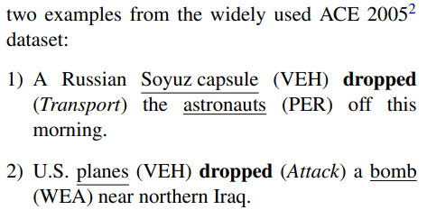 본문의 예시를 통해 구체적으로 살펴보면, dropped라는 trigger word는 1번 문장에서는 Transport라는 event를 표현하고 2번 문장에서는 Attack이라는 event를 표현합니다.