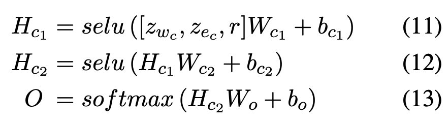 $where\;W_{c1} \in \mathbb {R}^{(d_e+2d_w) \times d_{c1}}, W_{c2} \in \mathbb {R}^{d_{c1} \times d_{c2}}, W_{o} \in \mathbb {R}^{d_{c2} \times d_{T}}$