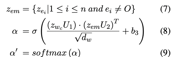 candidate trigger $z_{w_c}$와 entity type sequence $z_e$가 주어졌을 때, attention value는 다음과 같이 계산합니다.