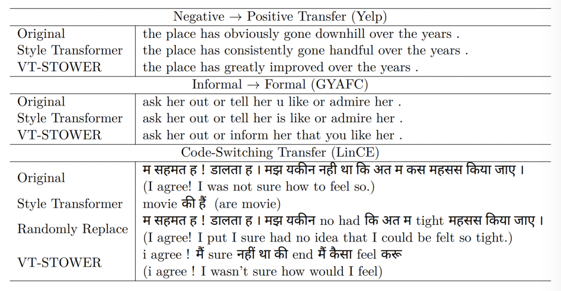 이는 VT-STOWER가 pivot word들에 더 집중할 수 있으며 어떤 단어들이 transfer 될 가능성이 높은지 인지하게 인지할 수 있게 합니다. 그렇게 해서 transfer accuracy는 높이면서 주제는 유지되는 글을 만들어 내도록 합니다. - 저자들은 본 연구가 code-switching을 style transfer의 관점으로 고려하여 연구를 진행하고 적용시킨 첫 번째 연구라고 주장합니다