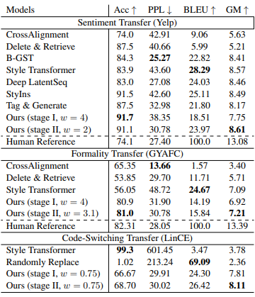 code-switching transfer에 대해서는, 이전 연구가 존재하지 않았기에 style transformer를 직접 학습시켜 비교했는데,