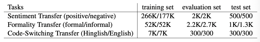 본문에서는 sentiment transfer, formality transfer, code-switching transfer 세 가지 task로 실험을 진행합니다.