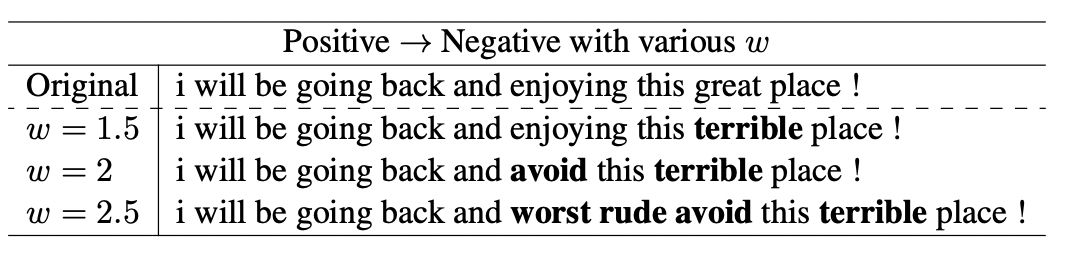 $w=2.5$의 결과는 더 부정적인 단어로 교체가 되었지만 문장의 자연스러움은 고려되지 않은 결과가 나오게 됐습니다.