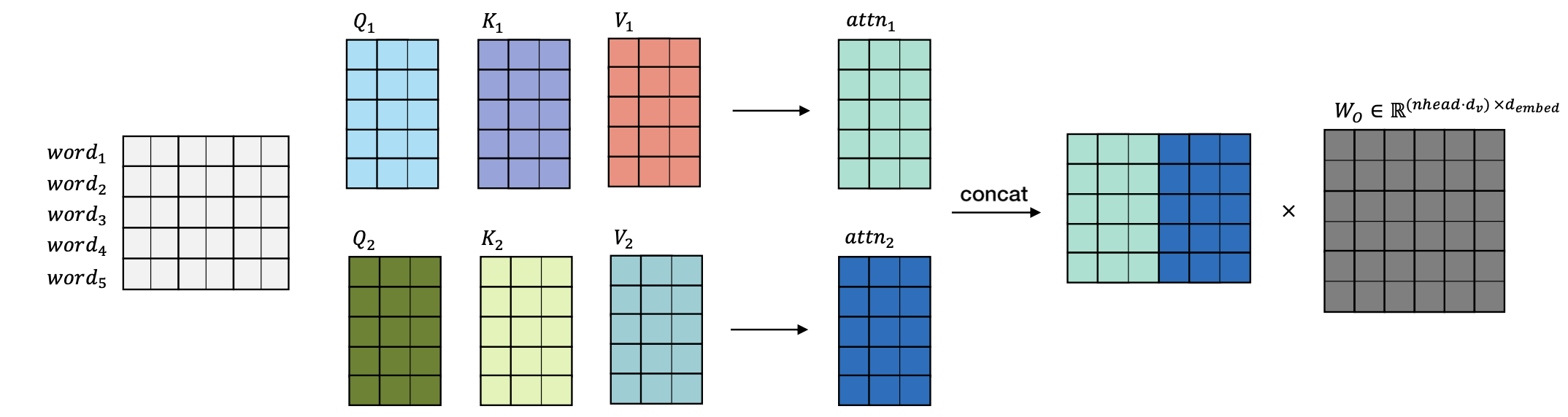 Transformer 모델은 attention 연산을 할 때 각 data에 대해서 한번의 attention 연산이 아닌, 여러 번의 attention을 병렬적으로 나누어 연산하도록 되어있습니다.