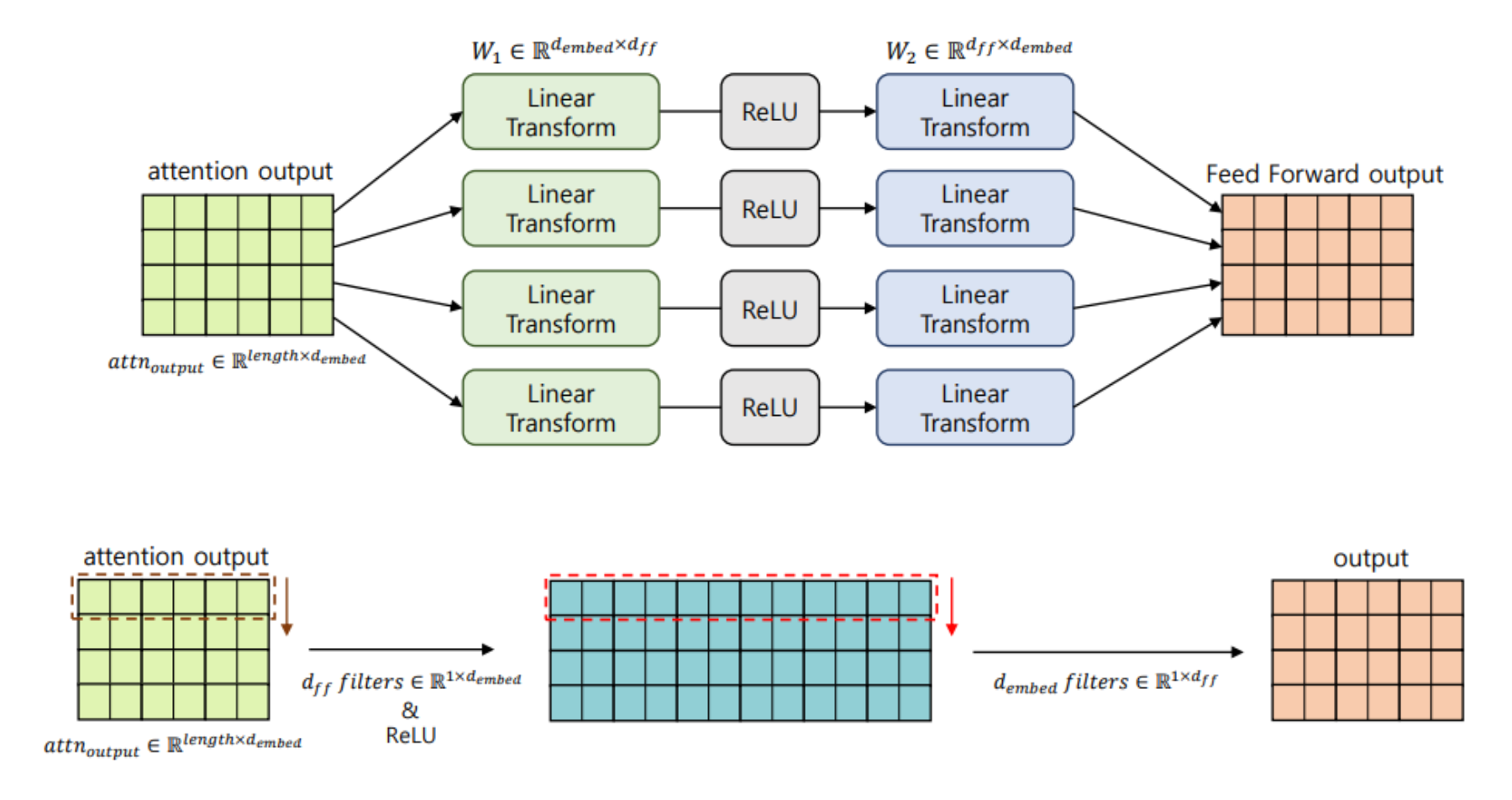 attention output에 non-linearity를 추가하여 feature 표현이 보다 풍부해지도록 ReLU actionvation function과 함께 Feed Forward Network를 추가한다고 생각합니다.